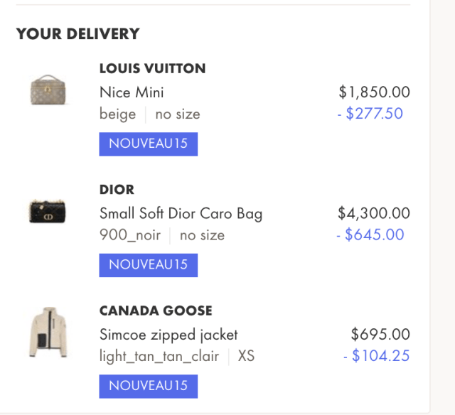 有趣的是,這個折扣其實有個小bug!如果你單獨購買像LV或Dior這樣通常不打折的品牌,系統會顯示折扣碼無效。但只要加入一件標示“滿$400使用台灣優惠碼NOUVEAU15享85折”的商品,整筆訂單竟然都能成功打折!雖然不知道這個漏洞還能持續多久,建議有興趣的朋友趕快行動。