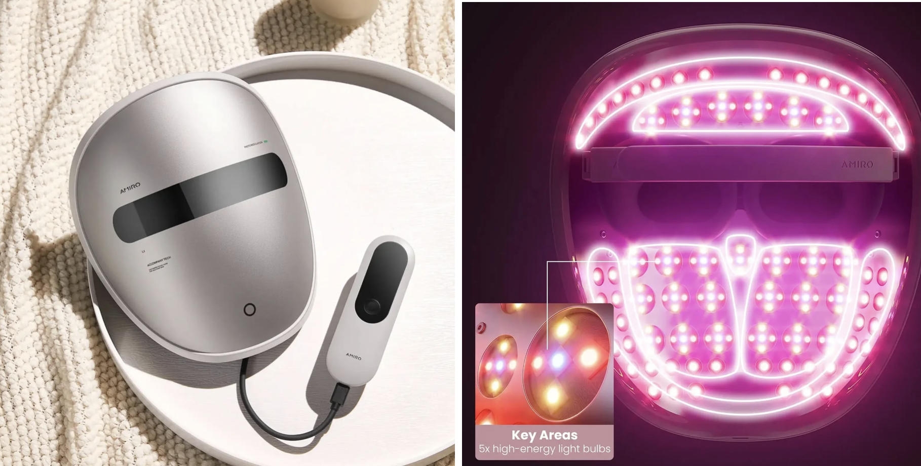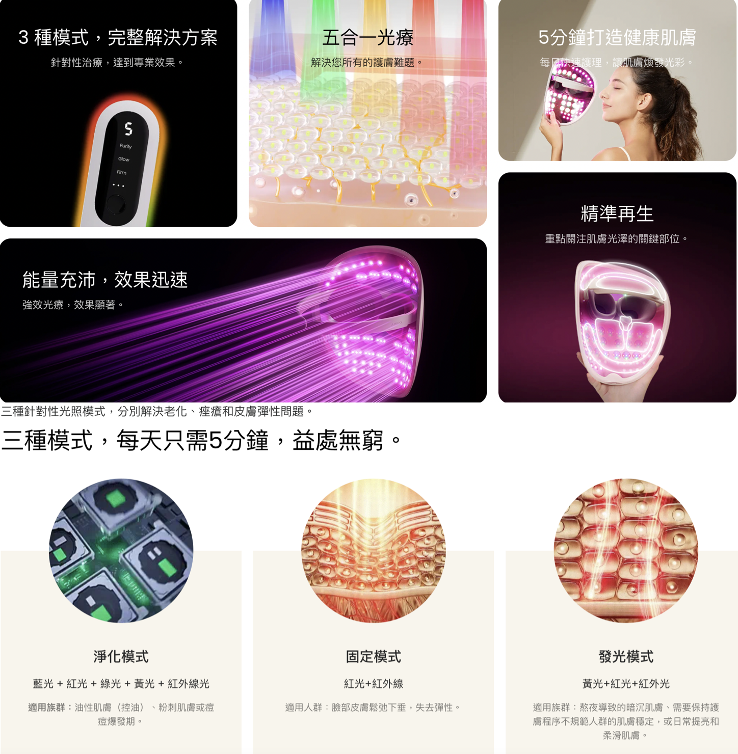 ( AMIRO Spectra 5-in-1 LED Light Therapy Facial Mask ) L2光療面罩,採用硬殼設計,不直接接觸肌膚,全臉貼合搭配眼部保護墊,確保光線不外漏並保護眼睛;具備臨床驗證的光療模式,紅光與黃光安全作用於膚色與色素沉澱,幫助改善黑斑與亮膚。結合淨痘、亮膚與緊緻三大模式,五色光能精準照護不同肌膚問題,讓肌膚看起來更透亮、均勻,使用簡單又方便。