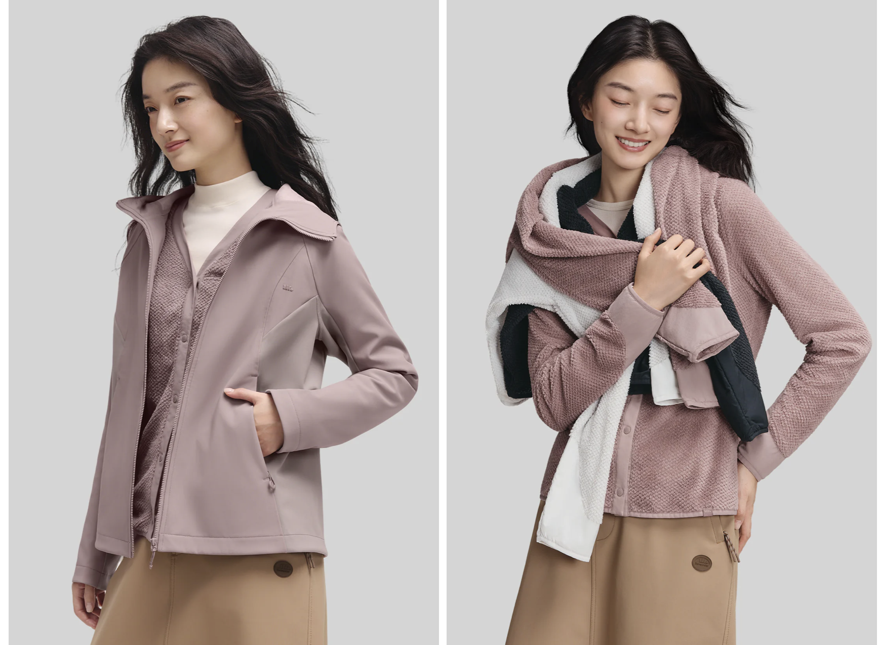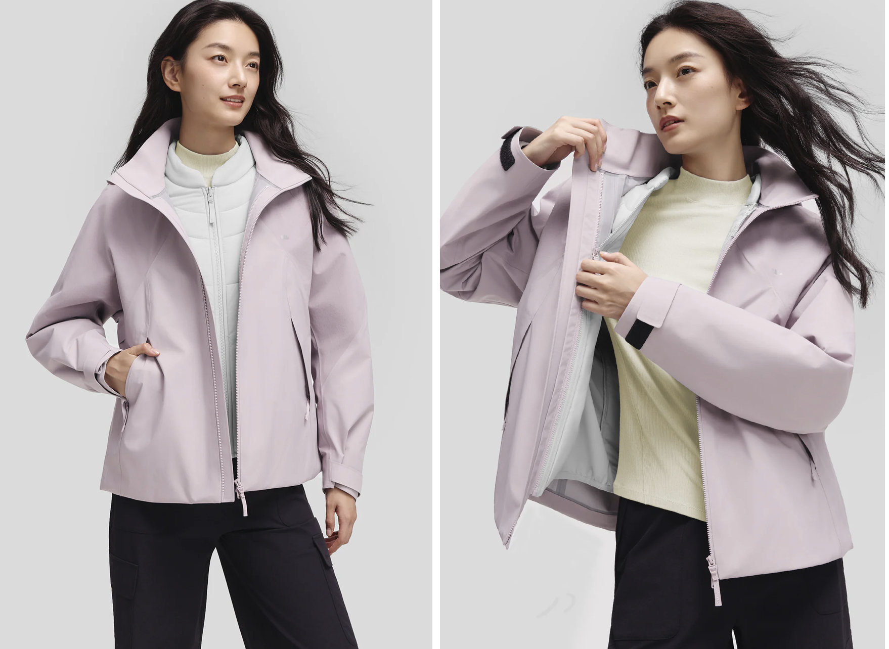玫瑰粉色真的美到不行,外層防風防水,內層保暖輕盈,兩件可以分開穿也可以搭配一起穿,多種穿法讓你隨心變換造型。
