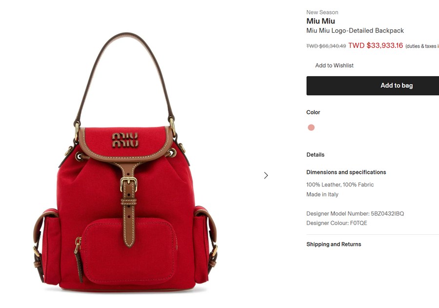 ♥ Miu Miu Logo-Detailed Backpack,這款小尺寸後背包原價NT70000,現在特價NT33933再享95折,等於46折!根本就是瘋狂折扣啊,手慢無!