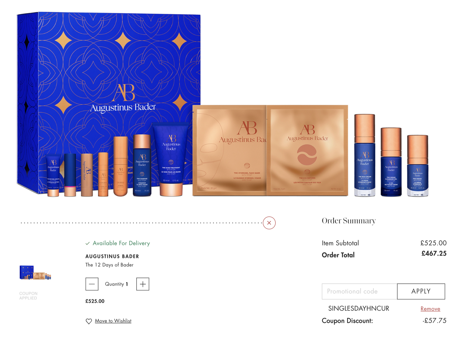 ( AUGUSTINUS BADER The 12 Days of Bader ) 德國AB倒數月曆也參加折扣啦!折後價為467.25英鎊,參考總價值881美金,相當於7折,對於愛用保養品的朋友來說非常划算!