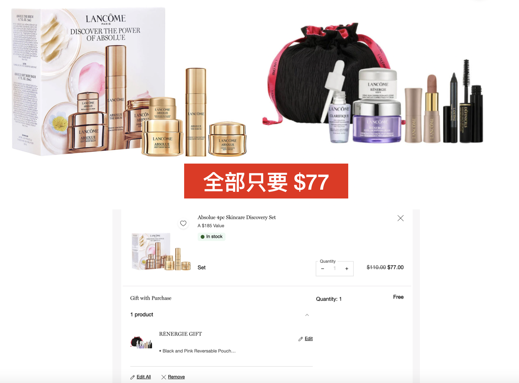 第一個推薦是 Absolue 4pc Skincare Discovery Set ,這組蘭蔻玫瑰四件旅行組原價高達$185,現在特價只要$77,相當於41折!更棒的是,只要滿$55美金,還會額外贈送價值$192的7件組大禮包。這樣算下來,您等於用$77買到了總價值$377的商品,平均下來僅需支付總價值的2折。這套旅行組包含:玫瑰霜Soft Cream、玫瑰眼霜、玫瑰身體乳霜以及玫瑰精萃,非常划算哦!別忘了使用台灣優惠碼來享受更多折扣。