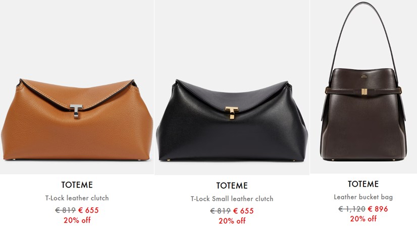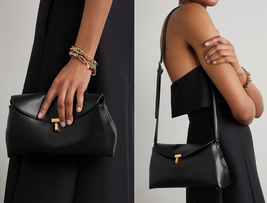 ◆ (Toteme T-Lock leather clutch)。Toteme T-lock包黑色也是首次在Mytheresa出現折扣啊!!原本就有定價優勢,現在折扣後僅655歐元(約NT23383),相當於68折!這款黑色雖然為光滑牛皮,但我覺得非常好顧,表面還是有處理過,因為我的水桶包就是類似的皮革。