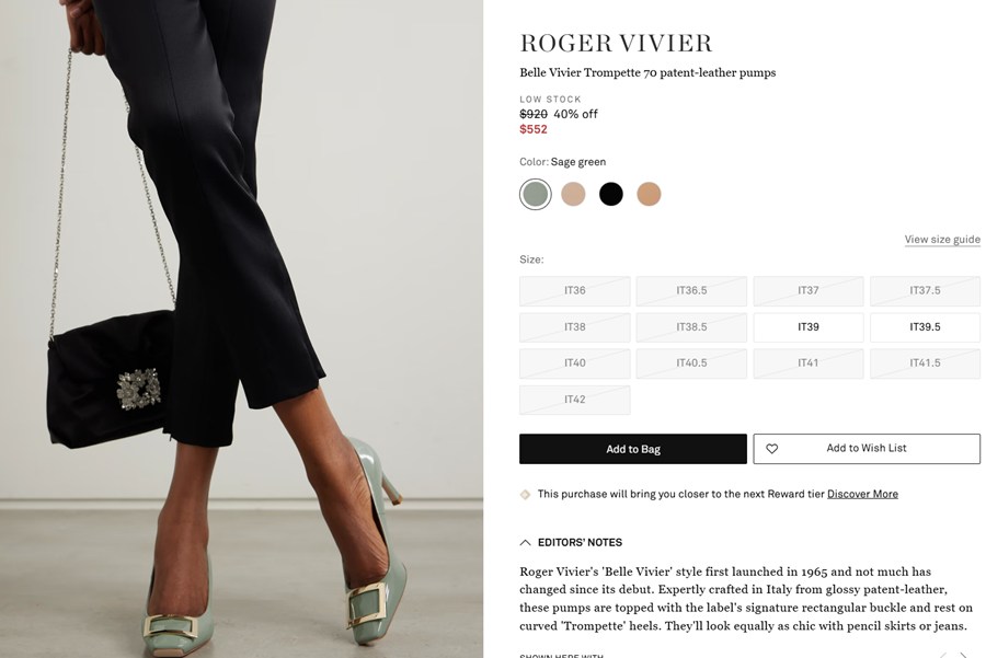 √ ( ROGER VIVIER Belle Vivier Trompette 70 patent-leather pumps)。最後推薦這雙藍灰色方頭高跟鞋,一樣在美國站享有6折優惠,簡約中帶點設計感,非常適合正式場合穿著!