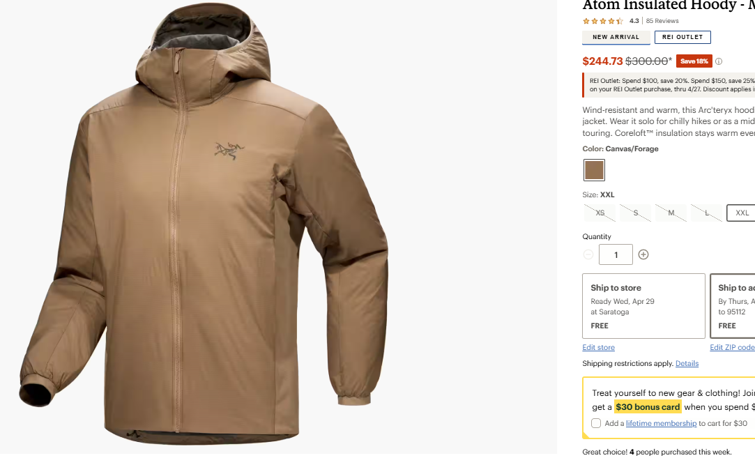 XS碼的朋友有福了!男款Atom Insulated Hoody現貨僅售$171。