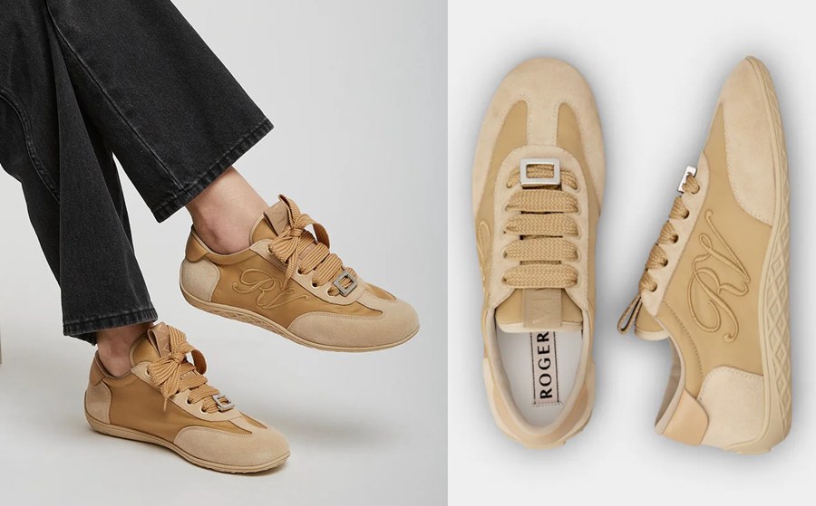 ♥ ( Roger Vivier Viv low lace white sneakers ),這款RV Viv Low駝色休閒鞋非常百搭,原價627美元現已降價至522.5美元,約NT162545,真的是超低價!目前還有36/38/39等尺寸。(Mytheresa售價1105歐元相當於41折)。我的腳長22.5cm寬9cm,平常多穿EU36,這雙Viv Low我穿36覺得前面空間還滿足,穿薄襪時前方依然有點空,但加上厚襪子也不會緊,整雙鞋質感偏薄軟。Mytheresa建議可以選小半碼,但我認為如果打算穿厚襪的人不一定要小半碼,只打算穿薄襪或裸腳穿的可以考慮小半碼。