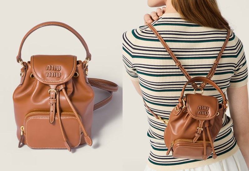 ◆ (Miu Miu Small cognac leather backpack) ,Miu Miu推出了一款超迷你的復古學院風後背包,售價2049.33美元,搭配首購9折碼【WELCOME10】+台灣關稅12%,總計約NT64264,相當於台灣定價八萬的8折好價!這款真的超可愛,現貨有限,喜歡的朋友趕緊下手吧!