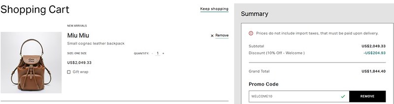▲ (Miu Miu 點這裡)。這次Miu Miu好多款式突然解禁打折,首購還能再享9折!只要使用首購碼【WELCOME10】,且商品沒有標示Ø符號,就能疊加折扣。這可是台灣優惠碼的好機會!