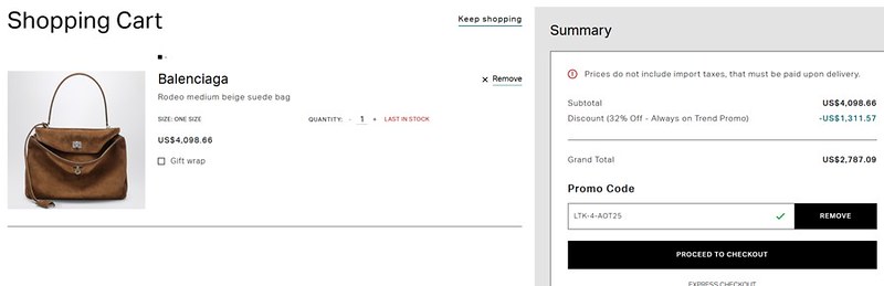 ◆ (Balenciaga Rodeo medium beige suede bag) ,Balenicaga中尺寸麂皮Rodeo售價4098.22美元+68折碼【LTK-4-AOT25】+台灣關稅12%,總計約NT97506,相較於台灣定價146000,等於66折!