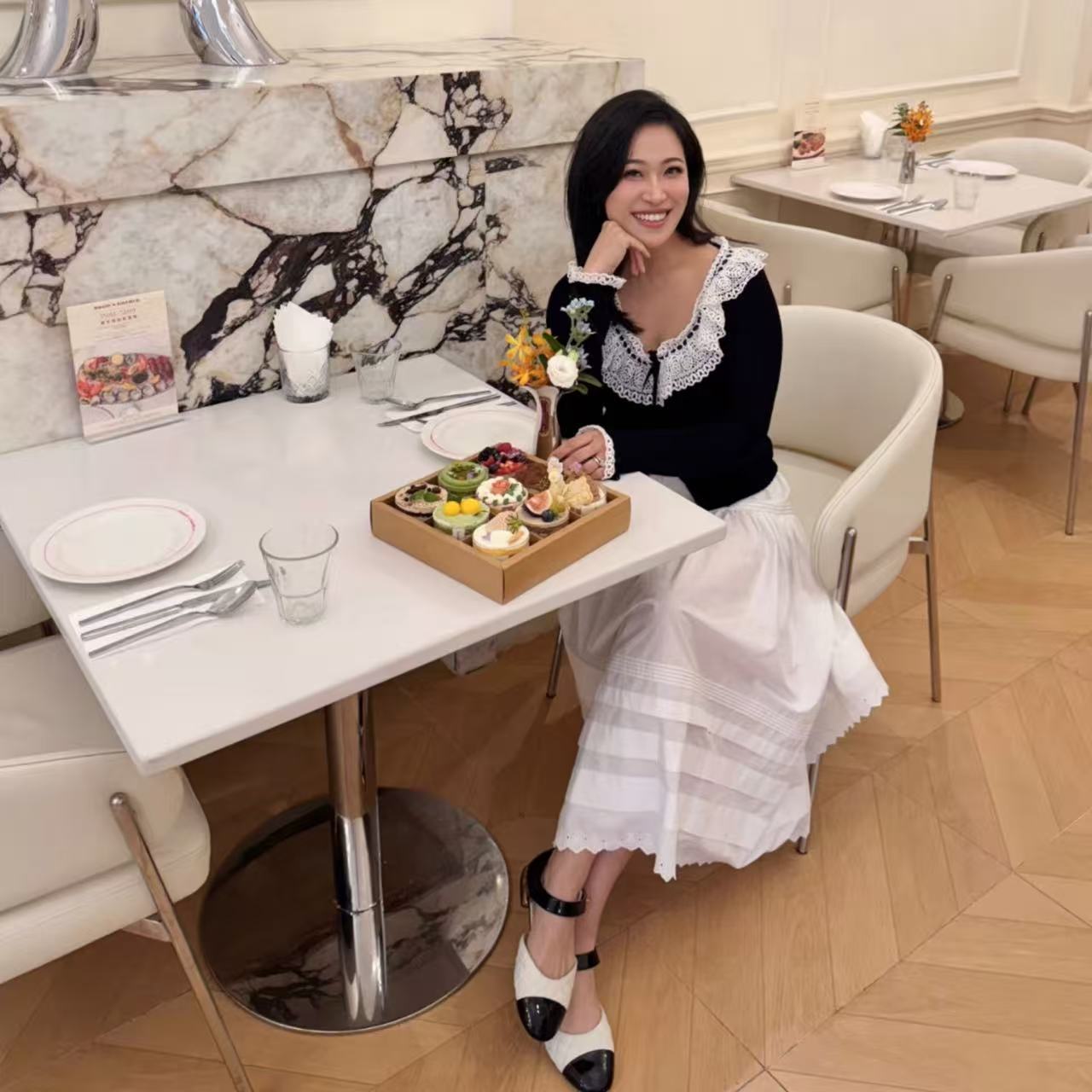 最吸引人的設計在裙擺處,融合了寬邊、細條壓條以及蕾絲刺繡,層次感十足,讓整體看起來優雅又有質感。不論是日常穿搭還是參加活動,都能輕鬆駕馭。